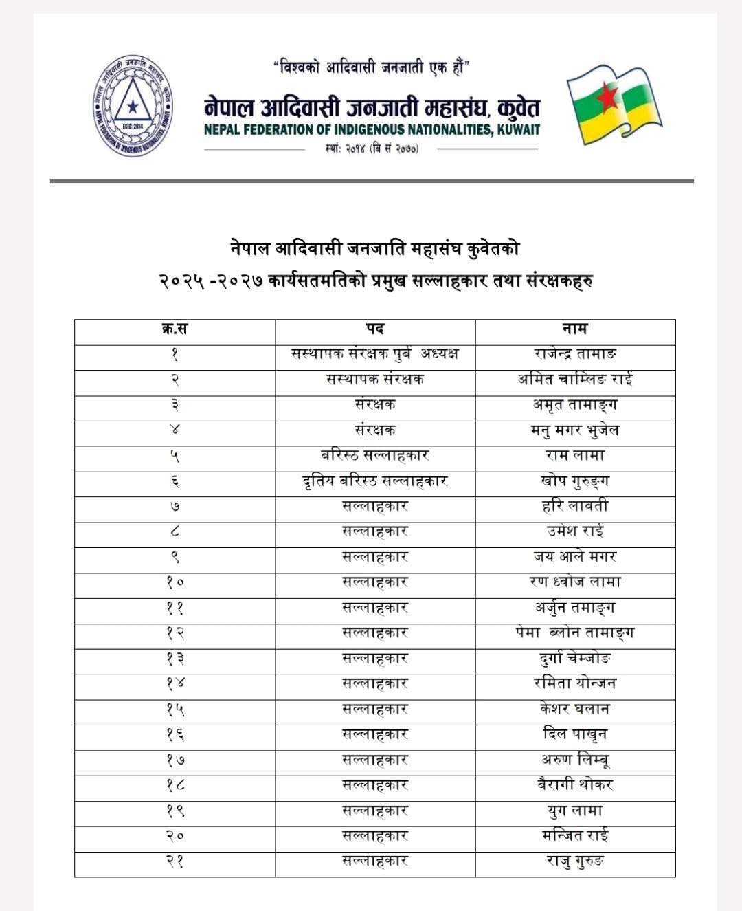 कुबेत : नेपाल आदिवासी जनजाति महासंघ कुबेतको ३१औं विश्व आदिवासी दिवस तथा पाँचौ अधिवेशन मिती १५ अगष्ट २०२५ शुक्रबारका दिन कुवेतको खैतानस्थित राजधानी प्यालेस होटल को सभाहलमा महासंघ कुबेतका अध्यक्ष अमृत तमाङको अध्यक्षतामा सम्पन्न सो महाधिवेशनले बलबहादुर काम्बाङ लिम्बुलाई (२०२५-२०२७) कार्यकालको अध्यक्ष नयाँ कार्यसमिति चयन गरेको छ।