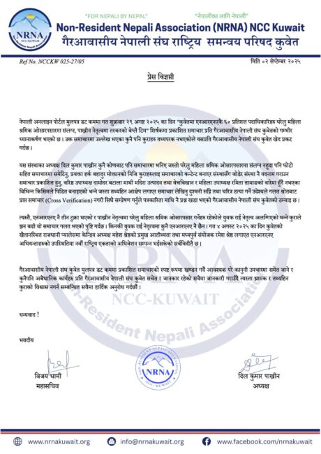 नेपाली अनलाइन पोर्टल मुलपत्र डट कममा गत शुक्रवार २९ अगष्ट २०२५ का दिन “कुवेतमा एनआरएनएकै ६० प्रतिशत पदाधिकारिहरु घरेलु महिला श्रमिक ओसारपसारमा संलग्न, पाख्रीन नेतृत्वमा तस्करको बेग्लै टिम” शिर्षकमा प्रकाशित समाचार प्रति गैरआवासीय नेपाली संघ कुवेतको गम्भीर ध्यानाकर्षण भएको छ । उक्त समाचारमा उल्लेख भएका कुनै पनि कुराहरु तथ्यपरक नभएकोले यसप्रति गैरआवासीय नेपाली संघ कुवेत खेद प्रकट गर्दछ ।
