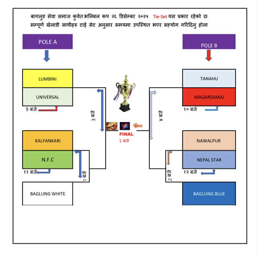बाग्लुङ सेवा समाज कुवेतद्वारा आगामी २६ डिसेम्बर २०२५ शुक्र्बारको दिन खुल्ला पुरुष भलिबल प्रतियोगिता १० टिमले सहभागी जनाएको छ।उक्त प्रतियोगिताको सम्पूर्ण तयारी पूरा भएको अध्यक्ष दिपकले नेपालीले जानकारी दिएका छन ।